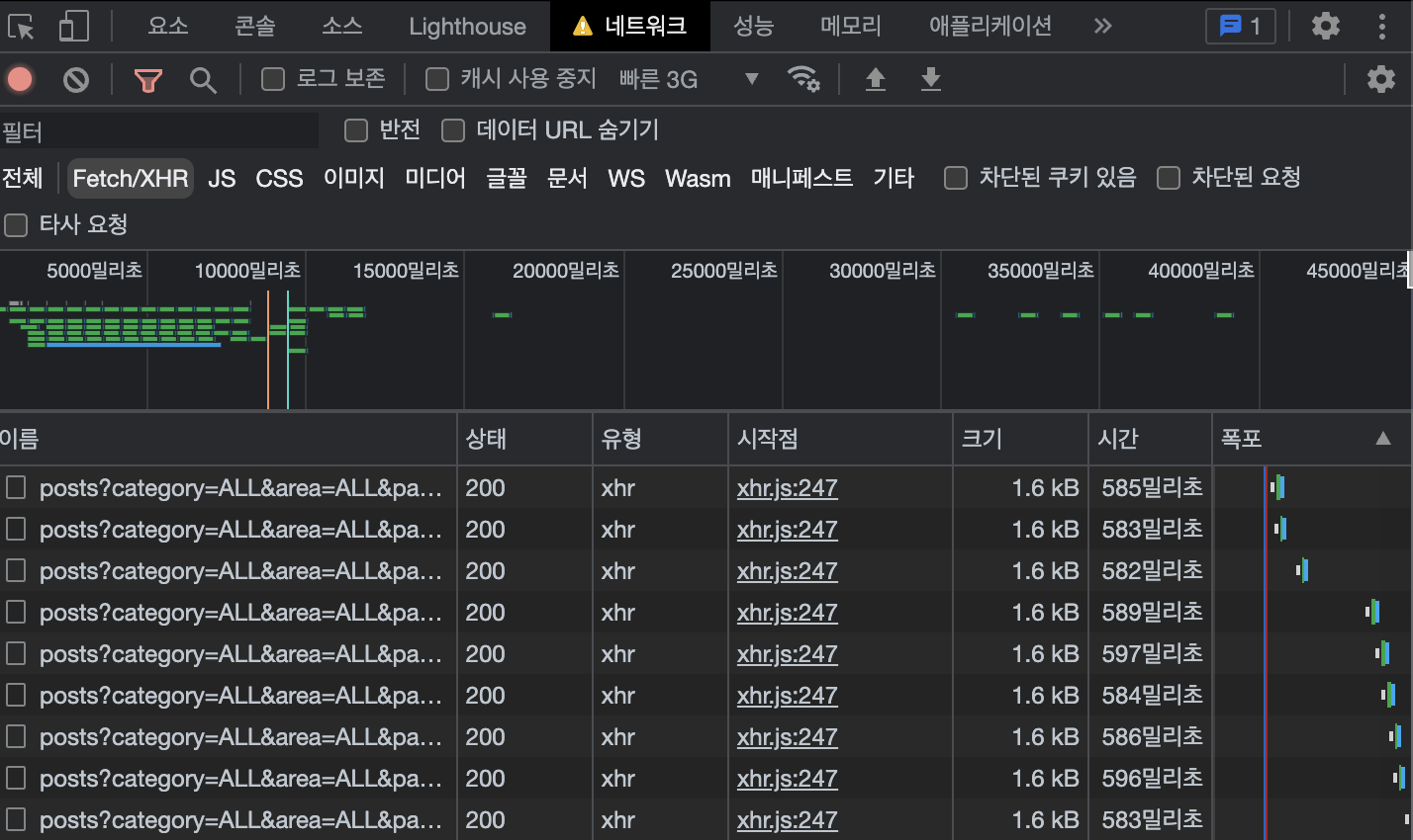 [느린 3G 모드] skeleton이 확실히 유저경험을 개선해주는 듯하다. 즉각적으로 요청이 가고 있다는 사실을 보여주면서 유저 이탈률을 낮추는데 도움이 될 것 같다.
