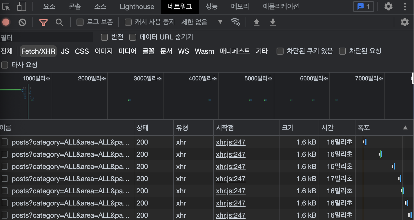 네트워크 탭에서 설정할 수 있는 3가지 환경에서 API 응답시간은 각각 평균 16ms(제한없음), 585ms(빠른 3G), 2.07s(느린 3G) 가 소요된다. 위의 환경별 영상을 보면, 빠른 3G 환경부터 어느정도 Skeleton이 의미 있는 것으로 인식되었기 때문에 빠른 3G 환경에서는 Skeleton을 살리고 제한없음 환경에서는 사용되지 않는 200ms를 설정했다.